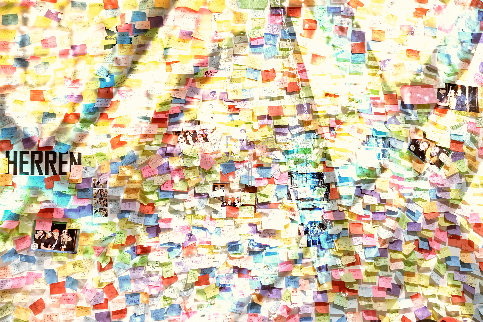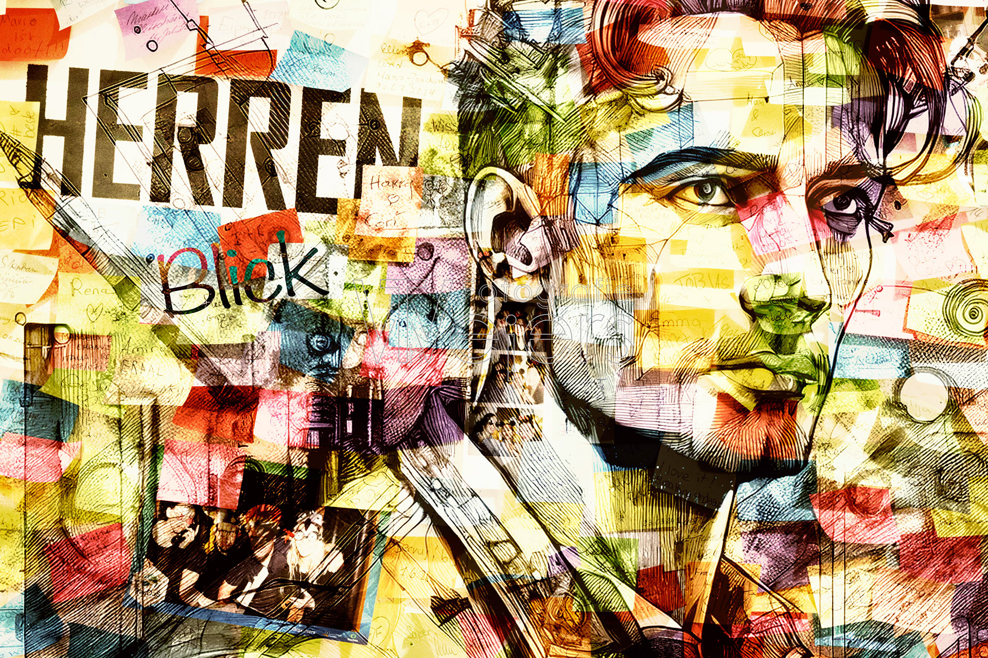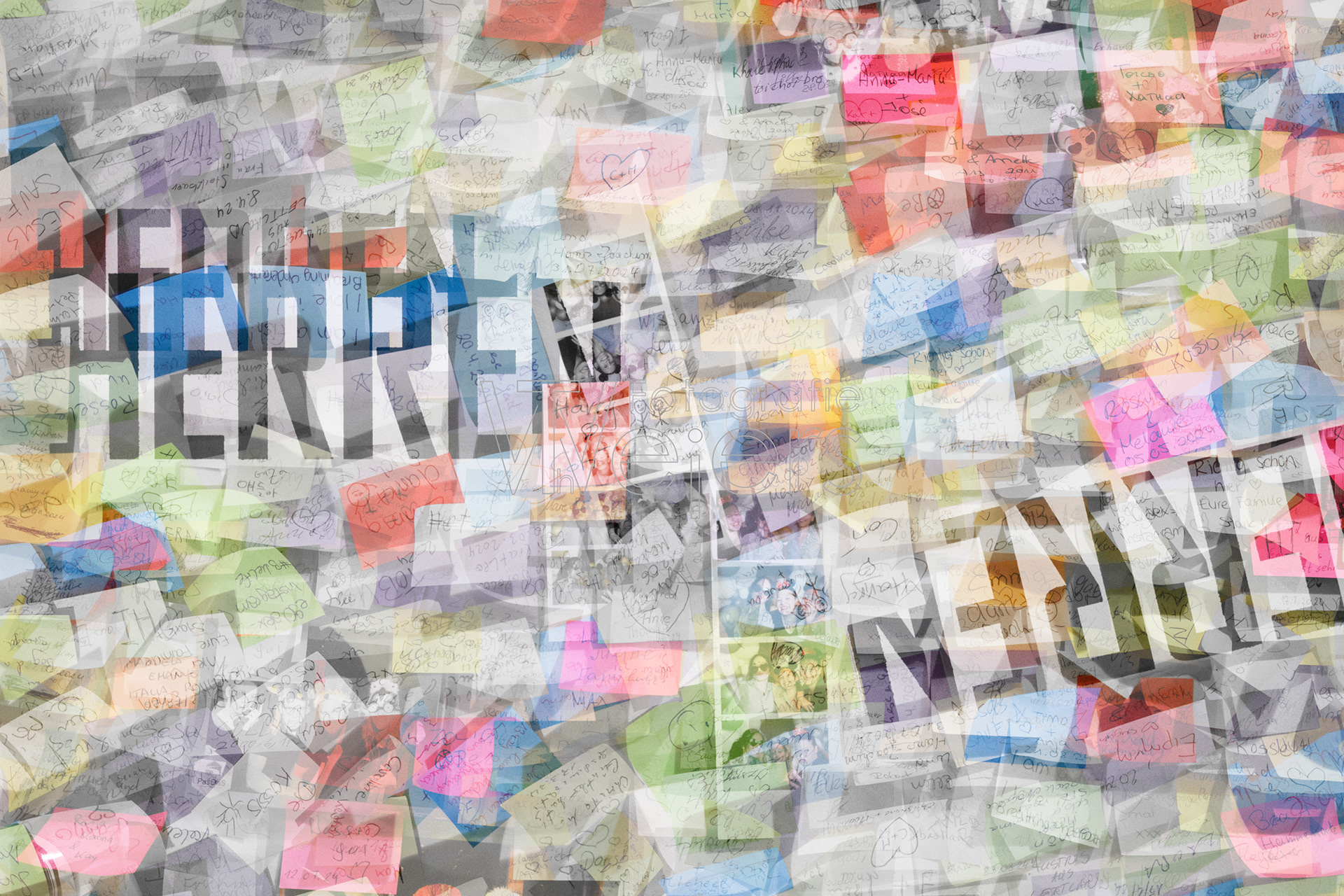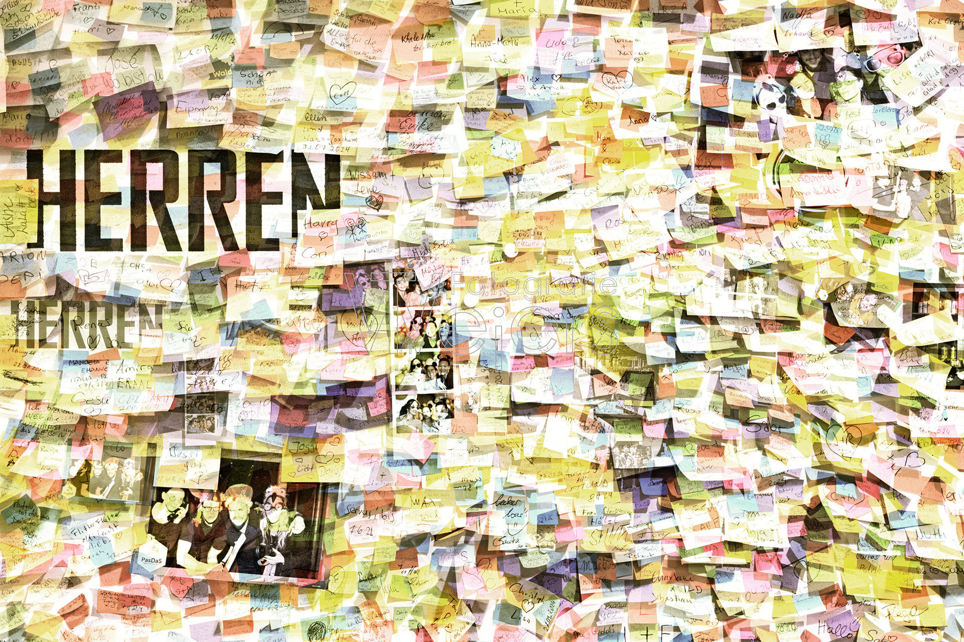 Die Idee zu dem Projekt ist recht spontan entstanden. Grundlage sind Fotos von einer mit Post-it dekorierten Wand. Dies Bilder sind dann in einer grafischen Bearbeitung mit anderen Bildern kombiniert.