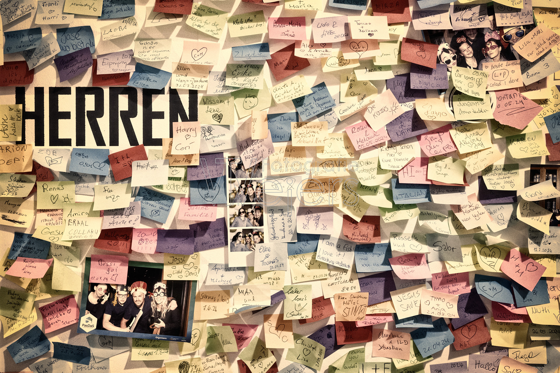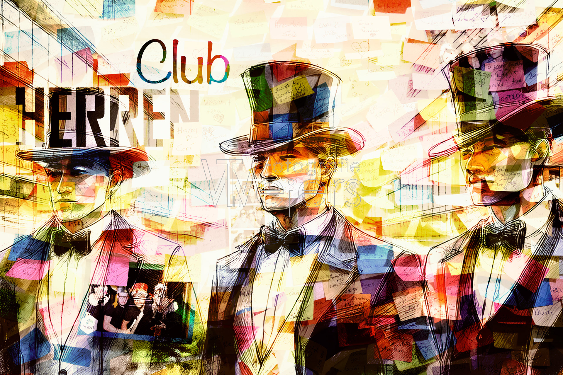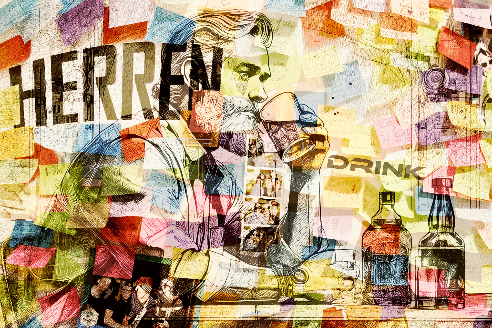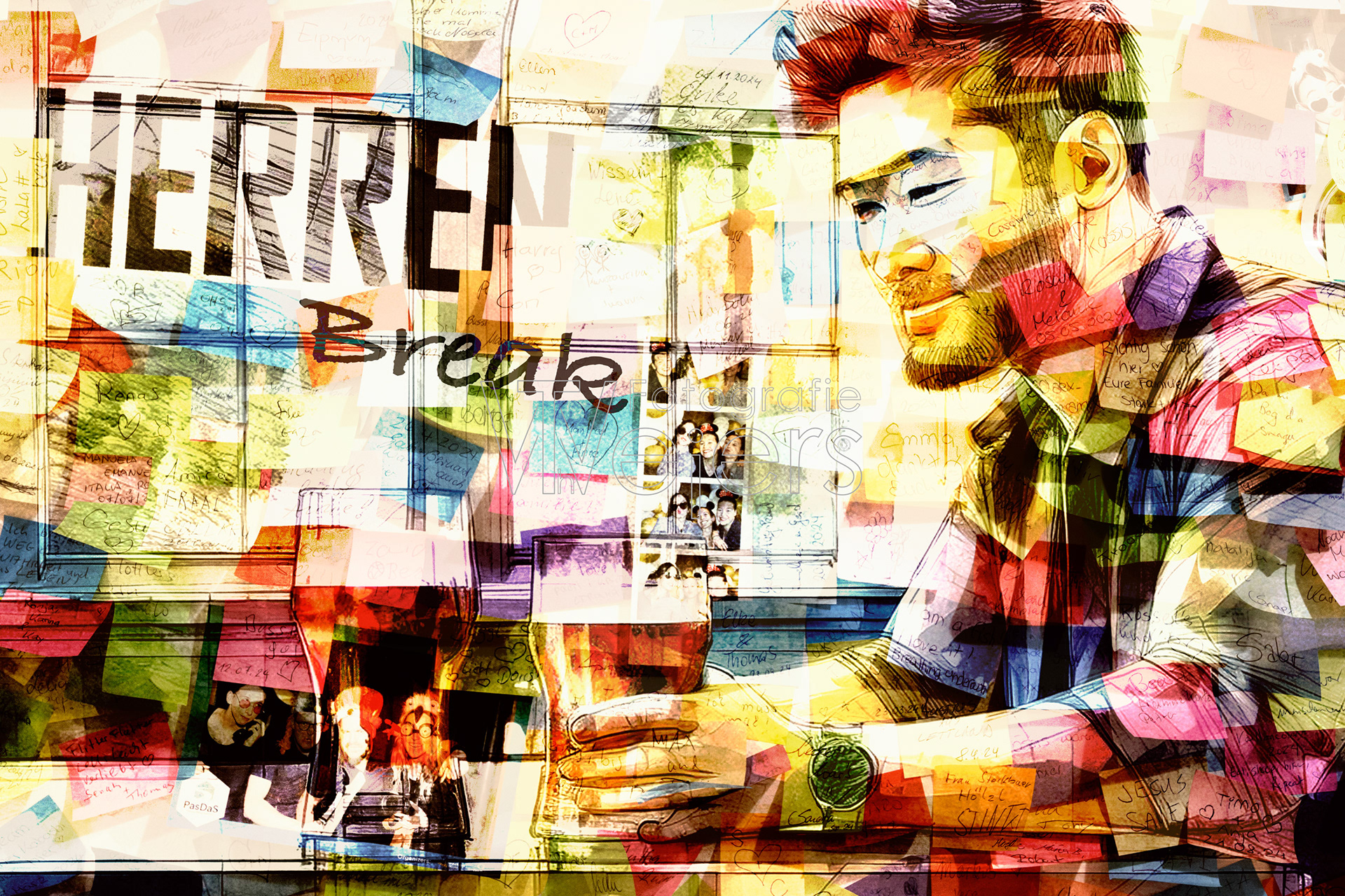Die Idee zu dem Projekt ist recht spontan entstanden. Grundlage sind Fotos von einer mit Post-it dekorierten Wand. Dies Bilder sind dann in einer grafischen Bearbeitung mit anderen Bildern kombiniert.